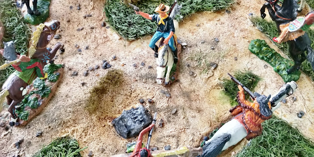 salut toujours avec mon décor ,j'ai en ai profiter pour faire une deuxième série de photos et une vidéo "la charge de 7th cavalerie" ,la plus part des figurines et chevaux 7th cavalerie sont de ma fabrication disons 80% les indiens la plus part sont des elastolins d'origine ou modifié et aussi pas mal de fait maison en résine il y a entre autres du lineol ,janetzki,preiser, diedhorff etc